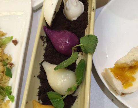很喜欢这家店,装潢富丽堂皇,银色的大马闪亮登场。感觉味道很不错,这个奶黄包的造型实在…猪杂粥是自选材料干净脆爽。白灼芥蓝和生菜美味鲜嫩, 儿子很喜欢,吃了很多。就是早上要10点才开张,没有早茶喝啦。