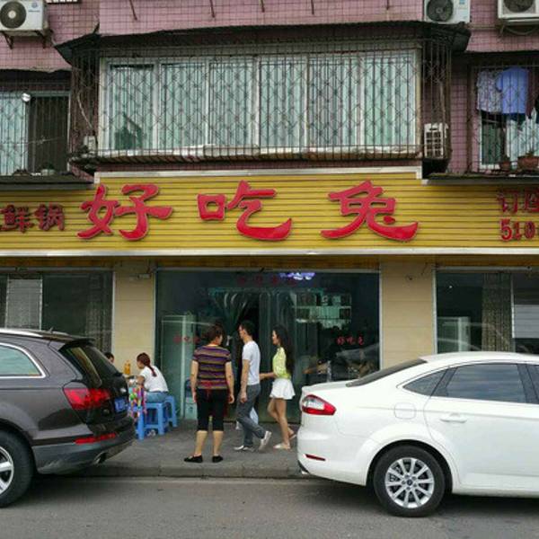 我是比较爱吃兔子的,16号的时候突然想打牙祭了,于是邀请朋友一起来到位于滨江路的好吃兔餐馆。这家店已经有十年的历史了,它位于滨江公园中段。交通十分方便,坐1.2.3.路车在鼓楼坝站下,向江边走100米即刻可到...我是比较爱吃兔子的,16号的时候突然想打牙祭了,于是邀请朋友一起来到位于滨江路的好吃兔餐馆。这家店已经有十年的历史了,它位于滨江公园中段。交通十分方便,坐1.2.3.路车在鼓楼坝站下,向江边走100米即刻可到达。一般食客都是点锅兔子,然后吃完后烫点素菜,价格也不会贵,平均50元一人吧。好吃兔是由自贡的鲜锅兔改良而来。我在厨房里去偷看了来,步骤简单介绍一下:1:把鲜兔子切成小块,用料酒,胡椒,盐,芡粉码好。2:把长尖椒切成小段,仔姜切成细丝。小米辣切小段。再把老姜和大蒜切好。3:锅里放宽油先把码好的兔子炸一会儿。再盛出来。另一锅里放油,花椒,老姜大蒜爆炒。然后郫县豆瓣下锅翻炒,再下小米辣炒香。然后放水。煮出味后下兔子,大概煮两分钟。再依次放切好的长尖椒,仔姜丝,熟了就加各种粉状调料,就可以起锅了。很简单,就是粉状调料不认识。商业秘密啊!这家店生意很好,连店后的民居都征用了!虽然周围开了很多家吃兔子的餐馆,但是这家生意始终是最好的,不亏是老店。就是环境差点,服务员都是大妈级别的,没有颜值,而且服务也不怎么好。店外就是滨江公园,游玩跳广场舞的地方。好吃兔门店外。。。前台,很是简单成列了酒水和饮料,小锅好吃兔,分为微辣、中辣、特辣。小锅兔子肉大概有半斤、78元,中锅兔子肉7量的分量,88元;大锅为98元,兔子肉有1斤左右。图为小锅。好吃兔,小锅79元,加烫了一些蔬菜。蔬菜5元一个品种。白嫩的兔子肉,很香。空调、美女半边身子。。。店后面,因为生意好所以把后院民居全部租用了。厨房,冒死拍摄,所以胡了。