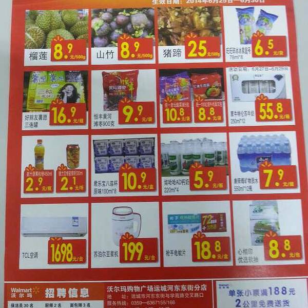 【位置】运城市河东东街与学院路交叉口新象城2楼。【交通】公交车:1/2/88路公交车都路过,1/2路公交1元,88路公交2元。【沃尔玛店铺】沃尔玛在新象城的二楼三楼,两层,二楼是入口,三楼是出口。但是节假日忙时,二楼也会临时设一个银台,结账出去。二楼货品是,洗漱用品、衣服、鞋子、儿童玩具、生活厨具、家用电器等等,三楼都是吃货的天地。面积挺大的,东西也比较全,全球连锁超市,服务也是很好的。三楼收银台的对面还有一排商户,卖内衣、饰品、爆米花还有沃尔玛的客服台。【个人感受】运城市区现有两家品牌连锁超市,沃尔玛和美特好。沃尔玛是最早先开的,俗话说先入为主,再加上沃尔玛超市那边好停车,地上和楼顶(四楼)都有停车位,以前停车位是不收费的,最近才可以,不过购物达到一定的数额,是可以免费的,具体亲们到时候再咨询下。沃尔玛挺人性化的,是运城首家超市提供免费接送购物班车的,因为正好跟公司一个方向,所以赶得上班点,我就蹭车了,嘿嘿,司机师傅很好,车很干净空调也很给力。超市东西还是很全的,相对本地超市,价格也算合理,不喜欢周末或者节假日,赶上超市活动,总是要排很长的队。沃尔玛的购物卡有本地的,也有全国通用的,这个挺方便的,这样子不会为找零钱而烦恼了。如果买了熟食,也可以去客服台加热的。有点缺陷,就是好像记得这家超市没有针对会员有什么优惠或者活动,别的超市都会给会员一些优惠政策的;店址在东区,属于运城的繁华区,只有这一家,没有分店,其他区域的人要过来购物,就相对比较远了。总的说来,这家沃尔玛占着地理位置优越、交通便利、东西齐全,还是有很多的客源的。【其他】沃尔玛四楼有个大地影院,一二三楼是商场,周边一公里餐饮住宿的可选择性贼多,很方便。