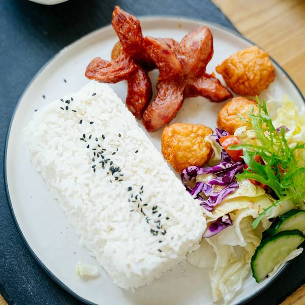 将咖喱酱直接浇在米饭上,配着外酥里嫩的黑猪香肠与黄金花枝丸,咖喱的香气与香肠、花枝丸完美的交织,此时此刻我只感觉自己是个快乐的肥宅。