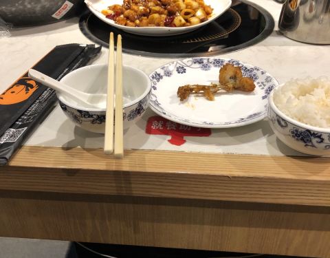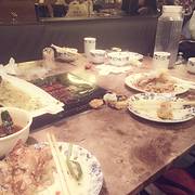 这是大厅的环境,不远处可以看到前台。他们家在二楼,一楼没有厅。上来地方还算是宽敞。人也是居多的。不过比起旁边的胡大来说,不用排队才是最愉悦的这里的环境很干净。价位也适中。服务员也挺多的,上菜也很快。所以总体服务质量可以算是OK的。我们点了很多菜,不过忘记拍了。都是干锅的,有皮皮虾和干锅剥皮鱼,皮皮虾不稀奇了,听说剥皮鱼是海鱼做的。它和皮皮虾是同样的锅底,有青笋、芹菜、圆葱、玉米。这些配菜也是好吃得很,很入味。不过剥皮鱼那天有点不新鲜,我们退掉了。下次吃东西还是要注意的,毕竟这是在夏天。还好拍到了桌子上餐盘里剩余的皮皮虾壳,不然真看不出来我们吃了啥。啊哈哈。