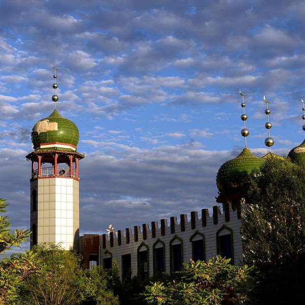 中午出发,慢慢的雨也停了,一路好走,下午5点到银川。住下酒店后,天色很好,丝毫没有傍晚的感觉。放下行李到新月广场附近闲逛,广场边的小湖和旁边的清真寺在蓝天白云的映照下,又有着黄昏的阳光,美极了。