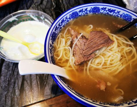 朋友之前来过兰州,推荐马有布拉面好吃,午饭时间所以来试一试。 就在中山桥的对面马路,很容易找,面条韧细,兰州拉面的标配再加几块萝卜片,习惯性走葱免辣,牛肉软香,感觉汤底与别家不同,多了点点姜味,好吃 ,不过青海酸奶真的好酸好酸,不过也全部吃掉了。