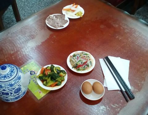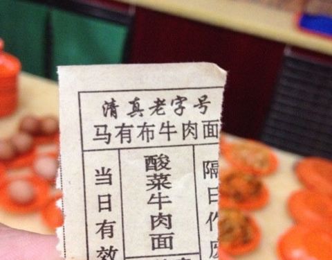 店里生意很好,但是店员服务却不差,进门左手边就是点菜的地方。单独一碗牛肉面是七元,价格比起外地的店很实惠哈!点好餐之后会给一个小票,自己拿到最里面的窗口,交给里面的厨师,然后等着取面就可以了。不过一定得记好自己的顺序,因为没有排号,所以有些游客就插队去端面了。兰州牛肉面讲求一清二白三绿四红,汤清、面白、葱花绿、辣椒红,缺一不可。当然,兰州人还有自己的吃法。那就是吃牛肉面要配一碗牛肉汤,喜欢的朋友可以找厨房要,免费提供的。然后是一叠小菜、一个鸡蛋,这是标配,要是奢侈一点呢,就是【肉蛋双飞】,一叠牛肉、一叠小菜、两个鸡蛋。看这牛肉的个头,比外地的面还是实在不少哟