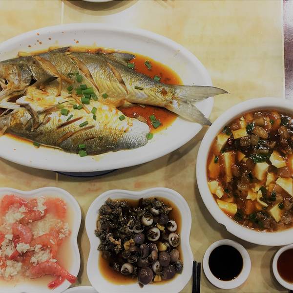 金秋十月的江南,正是吃海鲜最好的季节,鱼肥虾美。我翻阅了不下数十篇攻略后,最终选定“红灯笼龙凤饭店”作为我们午餐吃海鲜的地点,而且距离天一阁步行只有760米。