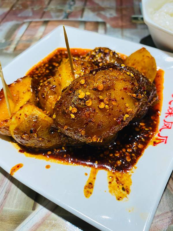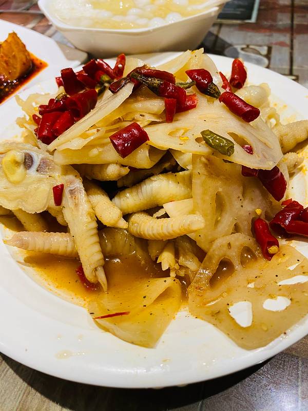 撸起袖子开吃吧,第一样,高师傅家的蛋烘糕,我们选择的是招牌的,奶油肉松,味道很棒。高师傅隔壁就是九妹凤爪,有几个口味,20块钱一份,其实可以每种都要一点的,我们开始不知道,就选了个泡椒的,味道不错,就是有一点点咸,配上一晚三鲜冰粉。甚好~九妹家的怪味土豆,一级棒,5星推荐三鲜冰粉