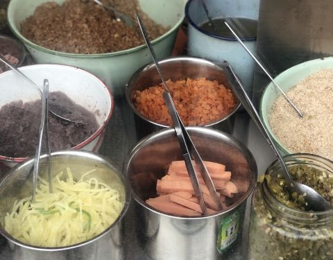 高师傅的蛋烘糕,没有店子就是一个摊摊,两个炉子加各色馅料就组成了,明码标价,最贵5元一个,也可以两个口味拼,还是只收5块钱。 最好吃的搭配有两个,一个是肉松芝麻,一个是奶油肉松,吃的时候可以让高师傅烤的老一点,这样外皮是脆的,内里却是入口绵软。