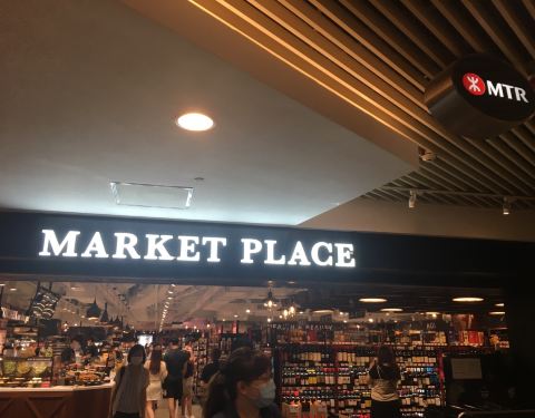 逛完了朗豪坊想乘地铁离开,Market Place就在通往地铁口的必经之路,MTR(香港地铁)的标志挂在Market Place的店名旁。想买水喝,附近找不到其他超市,正好在Market Place购买饮用水。