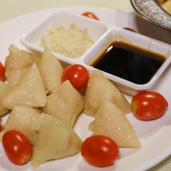 因为我们想吃鸭掌和猪蹄的双拼,这种只有中份所以就点了这个,然后还加了一个被极力安利的糯米小白粽,听说蘸红糖裹黄豆粉很好吃。这一锅端上来的时候真的分量好大啊,用脸盆装的,吓我们一跳。