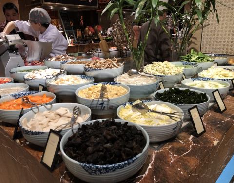 火锅自助晚餐。甜点无限惊艳。火锅汤底也种类繁多,四川麻辣,泰咖喱,冬阴功汤,鸡汤。海鲜品种和蔬菜种类齐全。