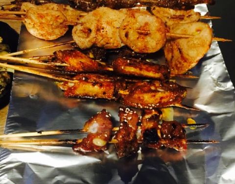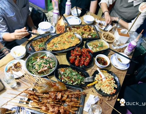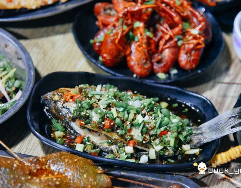 重庆人的夜生活格外丰富,到凌晨是常有的狂欢,因此很多店也是营业到凌晨两三点,在重庆,最不愁的就是夜宵去哪里? 神伙烧烤,仍然是当地小伙伴带路,位于南坪东路,本想着上南山一棵树看夜景,但还是选择了吃。 据说也是重庆排队最狠的一家烧烤店,从路边摊到现在多家的分店,来晚了还是得排队。 没有菜单,直接在冰柜前选食物。店内的一幅墙绘便是当年摆摊的场景。 小龙虾,跟别的店不一样,这边是先卤后烤的做法,龙虾是带着卤香味的! [强]苕皮,这是第一次吃上苕皮用烤的,而且相当大串!感觉女生吃下一串就半饱了!Q糯有嚼劲,带点微辣感觉超棒! 烤鲫鱼,汤汁带点麻辣的感觉,鱼肉鲜嫩。 包浆豆腐,豆腐很嫩,咬上一口有种呼之欲出之感 肉串当然不能少,蜜汁排骨、小牛肉、牛肉片都点上一些。尤其推荐蜜汁排骨,带着蜂蜜的甜和孜然的烤香,如果不爱吃辣的这个就很赞。 下酒菜当然少不了烤鸡爪,也是店内一绝,有劲道。 搭上2两江小白,人生几何,把酒撸串呀!痛快!