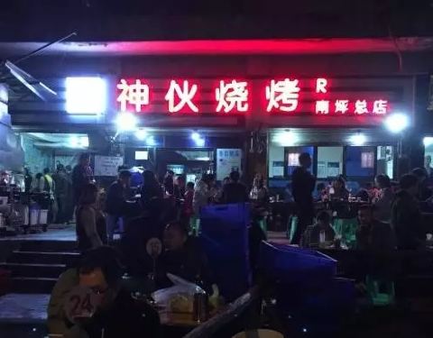 重庆人的夜生活格外丰富,到凌晨是常有的狂欢,因此很多店也是营业到凌晨两三点,在重庆,最不愁的就是夜宵去哪里? 神伙烧烤,仍然是当地小伙伴带路,位于南坪东路,本想着上南山一棵树看夜景,但还是选择了吃。...重庆人的夜生活格外丰富,到凌晨是常有的狂欢,因此很多店也是营业到凌晨两三点,在重庆,最不愁的就是夜宵去哪里? 神伙烧烤,仍然是当地小伙伴带路,位于南坪东路,本想着上南山一棵树看夜景,但还是选择了吃。 据说也是重庆排队最狠的一家烧烤店,从路边摊到现在多家的分店,来晚了还是得排队。 没有菜单,直接在冰柜前选食物。店内的一幅墙绘便是当年摆摊的场景。 小龙虾,跟别的店不一样,这边是先卤后烤的做法,龙虾是带着卤香味的! [强]苕皮,这是第一次吃上苕皮用烤的,而且相当大串!感觉女生吃下一串就半饱了!Q糯有嚼劲,带点微辣感觉超棒! 烤鲫鱼,汤汁带点麻辣的感觉,鱼肉鲜嫩。 包浆豆腐,豆腐很嫩,咬上一口有种呼之欲出之感 肉串当然不能少,蜜汁排骨、小牛肉、牛肉片都点上一些。尤其推荐蜜汁排骨,带着蜂蜜的甜和孜然的烤香,如果不爱吃辣的这个就很赞。 下酒菜当然少不了烤鸡爪,也是店内一绝,有劲道。 搭上2两江小白,人生几何,把酒撸串呀!痛快!