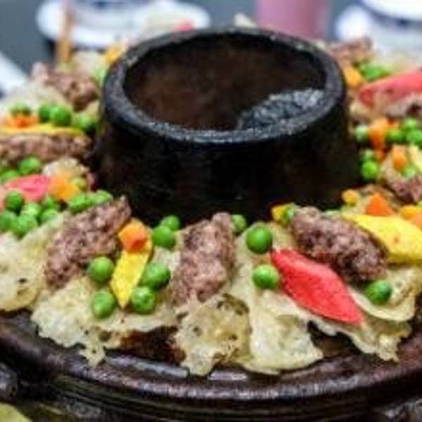一大堆鱼肉蔬菜放进土制火锅中慢慢烧,平时要预订,至少需四五个小时制作,但我们等不及,姜嫂在一个...