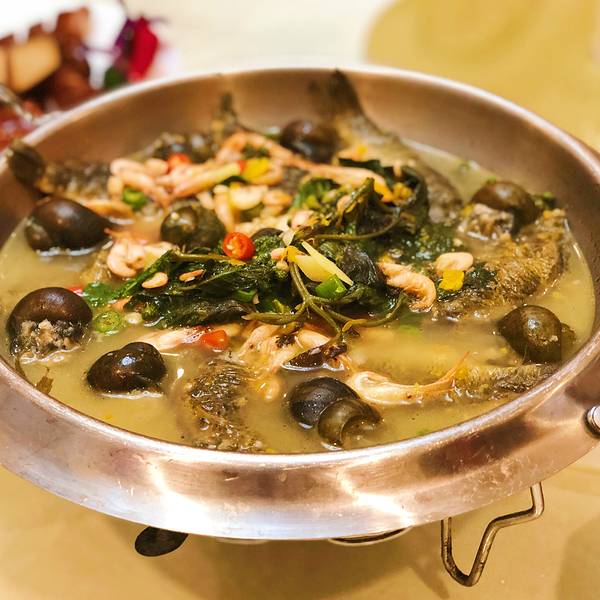 整个口感清香鲜辣,味道复合浓郁 主要由田螺酿肉,漓江虾,荷花鱼制作而成。