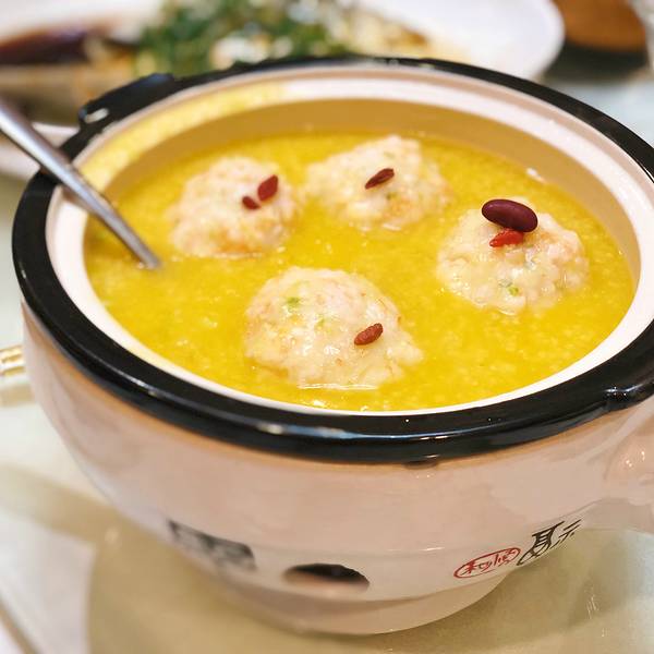 狮子头主要用虾仁制作 小米粥中也融入了虾仁的鲜美度