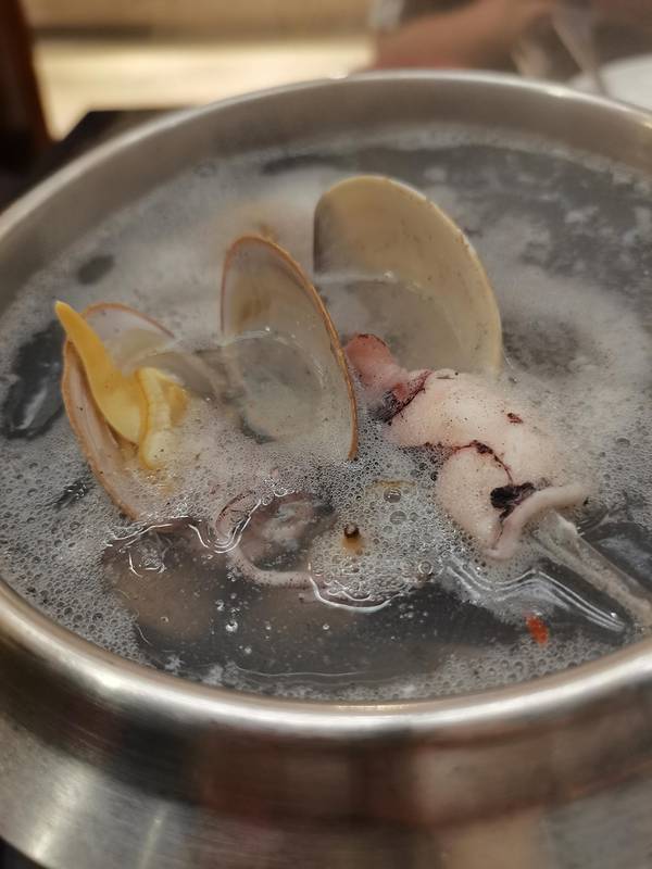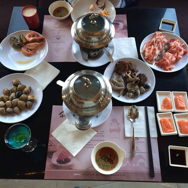 - 扇贝等新鲜的海鲜食材。生鱼片、海鲜、西点,种类很多,食材也都很新鲜的,用涮锅涮一下,美味啊