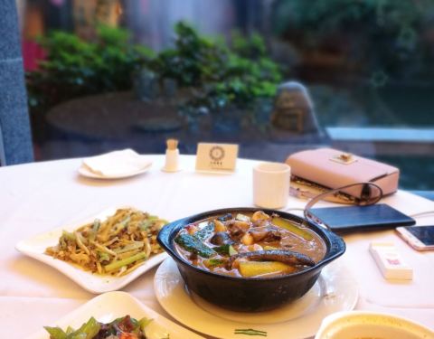山庄环境很不错,中餐厅的环境干净,服务好!晚上饿了,2个人随意点了几个菜。笋很嫩,好吃!肉是什么肉忘了,野味,不过感觉不野,但口感没吃过。还有个三鲜类的,田螺黄鳝泥鳅一起炖的,很鲜!至于那一小碗汤,太油了。总体很不错,价格嘛,还能接受吧,有点贵。