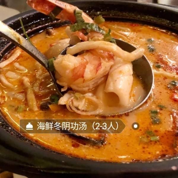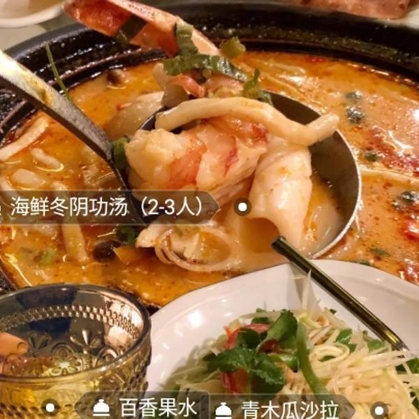 凤评价 很清爽的味道――第一次为沙拉折腰四 味道: 海鲜冬阴功汤(2-3人)放了椰奶的冬阴功一点也不辣完全不拉份量很小 里面有虾有青口贝有蘑菇番茄总体比较一般碳烧泰式猪颈肉比较一般没啥惊艳但是不难吃炭烧鱿鱼拌木瓜丝青芒果色拉服务员说这个菜要35-50分钟才做得好于是我和我朋友都不想点了后来看大众点评有人说可以分开上!先上沙拉等鱿鱼烤好单独上简直不要太棒这个操作