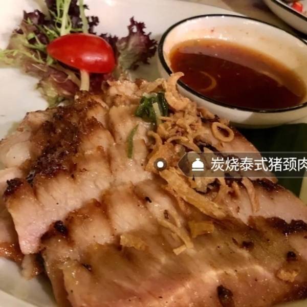 泰式鱿鱼粒炸虾饼虾饼厚实好吃蘸料不错碳烧泰式猪颈肉肉烤得很香蘸酱酸酸的感觉加了柠檬汁解腻