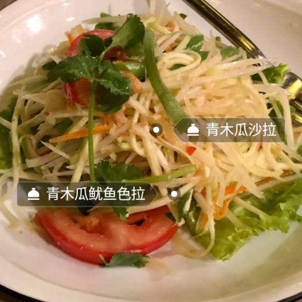 鱿鱼烤得...炭烧鱿鱼拌木瓜丝青芒果色拉服务员说这个菜要35-50分钟才做得好于是我和我朋友都不想点了后来看大众点评有人说可以分开上!先上沙拉等鱿鱼烤好单独上简直不要太棒这个操作幽青木瓜很好吃很清爽一点也不酸