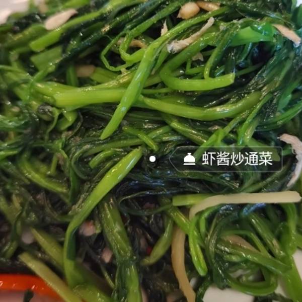 泰式鱿鱼粒炸虾饼虾饼挺实的有一点咸虾酱炒通菜味道还不错有点偏咸
