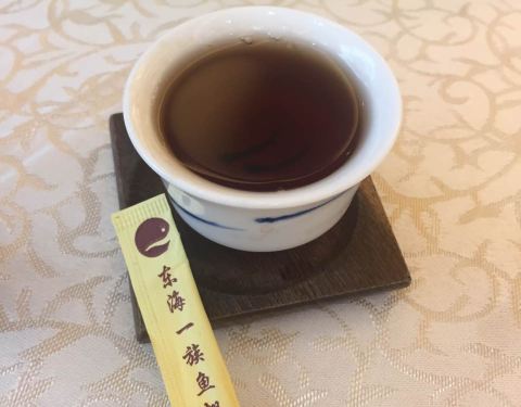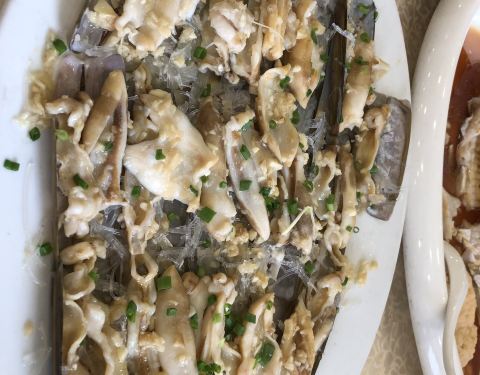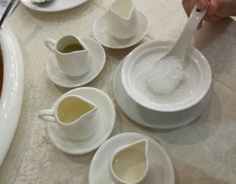 是比较高大上的一家海酒家,我们一家三个人吃了三盅辽参燕窝、白灼大对虾、密制烧鹅、介兰、清蒸老虎斑2斤