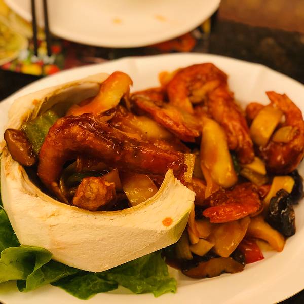猪颈肉不出彩,个人觉得没有泰皇吃起来是炸酥肉的口感。秘制椰青肉虾球,甜酸重甜,量大