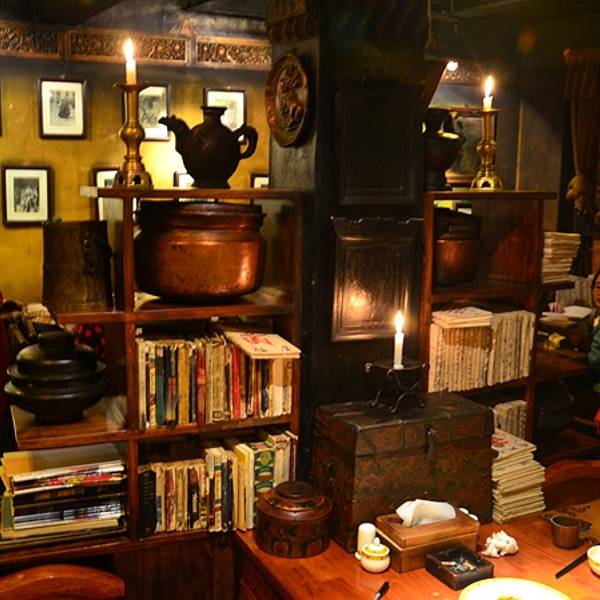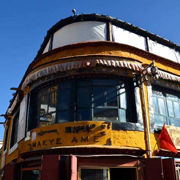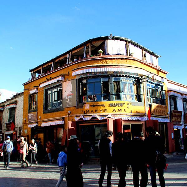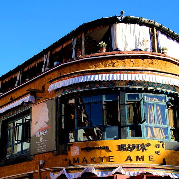 在拉萨有很多的茶馆,这是普通百姓最常去的地方,也是人们休闲聊天聚会的场所,在八廓街最好的喝茶发呆的地方,那就是“玛吉阿米”了。玛吉阿米这个黄色小楼在八廓街的东南角,有着浓郁的藏式风格,这里虽然装修...在拉萨有很多的茶馆,这是普通百姓最常去的地方,也是人们休闲聊天聚会的场所,在八廓街最好的喝茶发呆的地方,那就是“玛吉阿米”了。玛吉阿米这个黄色小楼在八廓街的东南角,有着浓郁的藏式风格,这里虽然装修过多次,但给人的感觉总是那么的古朴,黄色的外墙上玛吉阿米的画像带着忧伤的神情,让人看了不免同情和迷恋。玛吉阿米餐吧中各个角落都有藏式家具、古董和各种装饰品,很多物品还都是年代久远的古物。这里因为位置好外国人多,所以消费并不便宜,在吃饭的时候会有每人最低消费68元,一般人均价格在80元左右,但如果不挑拣的话可以要一壶20元的酥油茶慢慢喝,50元也可以吃饱的,但我想更多人来这里并不是为了吃,而是为了追寻那段美好的回忆。这里二楼在晚上还经常会有藏民的演出,三楼的露天楼顶也可以上去,平台上也是拍摄八廓街街景的好地方。