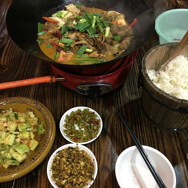 逛完十里画廊,天已经黑了,赶快乘搭环保车下车。晚上就在公园后面的那条末央街解决吧。上大众点评看美食还是管用的,那条街好多吃的,点评上的代计私房菜分数很高。于是按照导航去到了代记,但人实在太多了,要等位,我们实在太饿了,就选择了富正毅三下锅,一入门口处,就有一档烧烤的,如果点了烧烤,等烧烤食物上完了,就要先付钱,这里的烧烤一般般,调味料太重了。可能人太多,院子里都坐满了客人,问了一下服务员有空台吗?服务员都回答是自己找。自己找就自己找吧。找位子的时候,发现每台桌上都有一锅三下锅的,我们也不客气了,4个大人点了一锅中份的,微辣的,这味道好好喔,里面有三种肉类,有肥肠,牛肚,还有一种我不知道是什么,这菜很好下饭,我都吃了三碗,赞。
