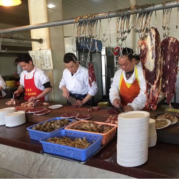 这家地道牛肉火锅在汕头好像有三家分店,我三次到汕头都是去的位于龙湖区南宁街1号的总店。这家店就在汕头火车站附近,招牌很显眼,远远就能看到,场地很大,前场后场还有二楼,加起来估计得有两三百张桌子,可见生意之火爆!店后院有很多停车位,营业时间一进门就能看到斩肉台,穿着围裙的师傅们排排站,忙碌的切着肉肉。一条条新鲜的牛肉就挂在斩肉台上方,整个店里都飘着牛肉的香味。