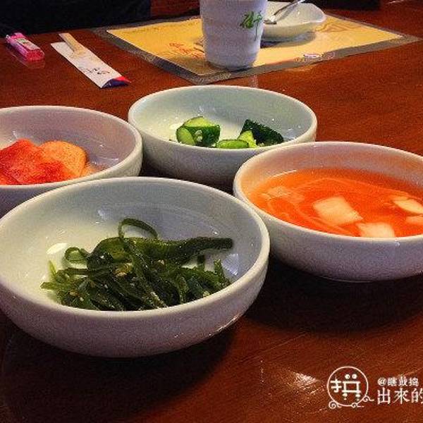 这家店非常有名,来这时排长队。 不过,味道那是真心赞,来这的朋友不要错过。苦等了半个小时,终于轮到我们吃啦~~ 先来看看这里的环境吧,绝对赞到家~~哈哈!我稀饭滴不得了! 餐前免费提供四色小菜!这估计是韩式烤肉的统一规矩吧!?桌前的餐具,整整齐齐摆放! 真吃起来,他们就不知道谁是谁啦~~~第一道洋气的大菜:鲅鱼左边的是鲅鱼,右边的是萝卜! 鲅鱼没有一点儿腥味,肉质酥烂,就连骨头也是入口即化。第二道贼心水的菜:韩国石锅拌饭味道很正,辣酱混在里面,我杠杠滴就吃了好几口。第三道洋气的大菜:韩式烤肉肉质非常好! 锅底的小火慢慢炖着,肉、菜和汤互相借味,融合的真是太妙了! 汤也很鲜,那真是回味回味哇~