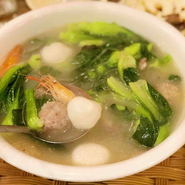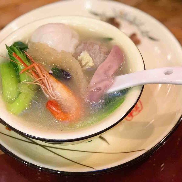 三鲜汤,看起来蛮清淡,喝起来也特别清淡。里面料蛮多,有粉条、鱼圆、小虾、咸肉、小青菜等等。