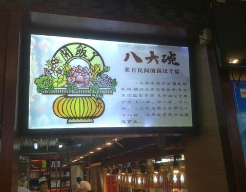 八大碗参照中式仿古的装修风格,细节处精益求精,墙体、灯笼采用人工手绘,餐饮环境宾至如归。八大碗——来自民间的满汉全席,其菜品既有中国传统风味,又加入了满汉全席的细致美观,将传统的东北菜演绎的淋漓尽致。