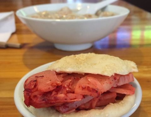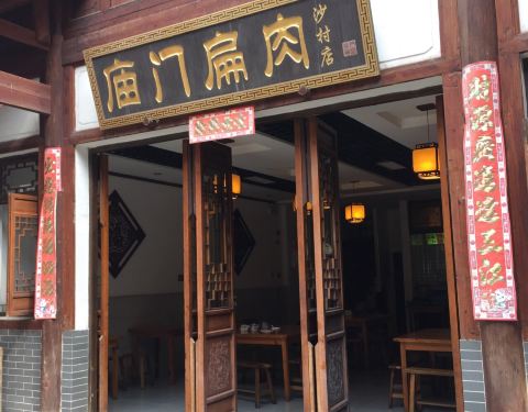 这店在广场右手边的一条路里面,庙门扁肉四个大字的牌匾大气!店里里也装修的很不错,仿古的桌椅,好大的一个店铺里,就我一个客人! 一份扁肉,相对于之前吃的扁食,这家的扁肉里面的肉馅有点脆弹,不是平时软烂的肉馅口感,应该是捶打的原因,挺好吃的^_^,笋夹饼也好吃,主要是里面的酸笋好吃^_^ 小吃城里比较不错的店铺,推荐^_^