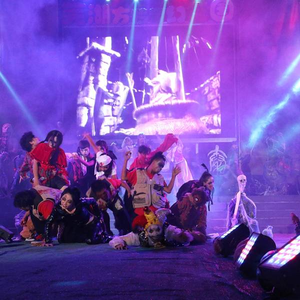 真么想到这里会有这么多人,公园到处都装扮成鬼屋的样子,感觉阴森森的。走到游客中心的服务台跟前,顺手拿了一张公园介绍导览图,才知道;这是一家以高科技主打、以中国神话为背景的文化科技主题公园,属于第4代主题公园,其实我不懂这几代怎么分的。嘿嘿……