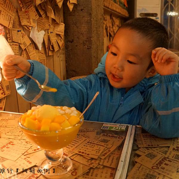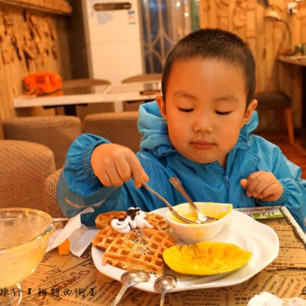 阳朔有个连锁店“芒果帮”,售卖各种芒果饮品和甜品,有很多很多家店面,每间店铺的名称有些许不同,比如我们去的这家就叫做甜品厨房。下午带着儿子去尝尝吧。下雨的缘故吧,下午四点多钟店里一个人都没有,依然是大众点评网的团购,芒果帮的团购非常多,要注意看一下适用店铺。我们选的双人甜品套餐:多芒椰汁西米露、杨枝甘露、多芒小丸子、芒果捞野(4选1, 原价25元), 港式甜品:芒果华夫饼、杨枝金捞(2选1,原价28元),团购价32.9元。