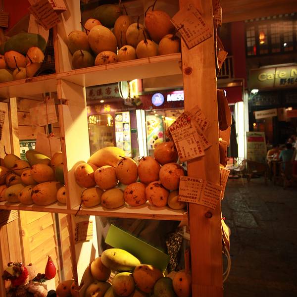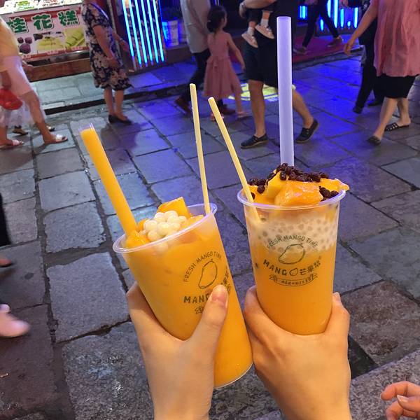 芒果帮也是西街上小有名气的饮品店之一,趁着夜晚,这里愈显的光鲜可口。让路过的人禁不住流口水那