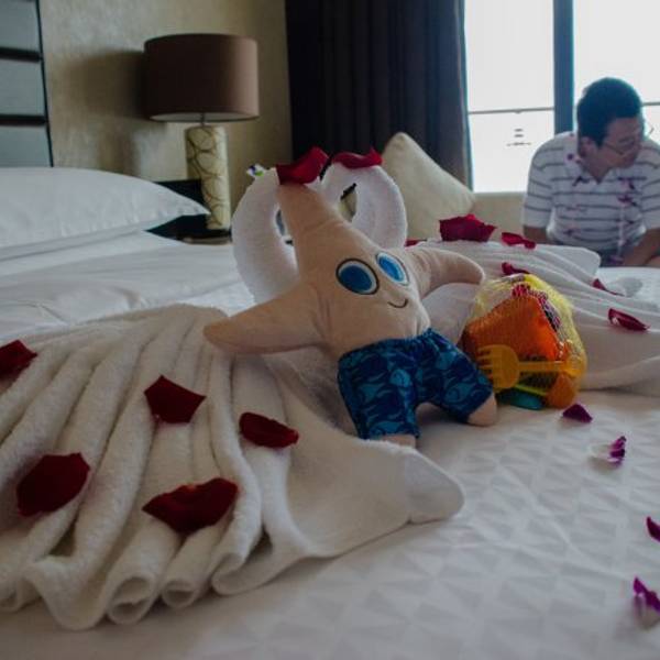 三亚湾的福朋喜来登酒店位于三亚湾海月广场,这里的员工脸上永远带着愉快、友善的微笑,让人一进入酒店就能嗅到轻松愉悦的度假味道,心情大好。更让人感动的是,进入房间时,我们赫然看到了前一天参加活动时的全...