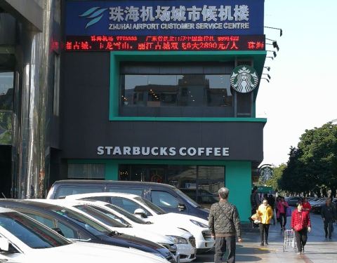...后,正好路过这里的中珠大厦,这里有机场大巴可以咨询,不过先在星巴克里点上一杯咖啡,坐下休息休息