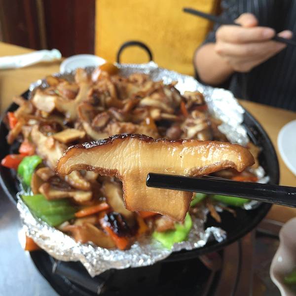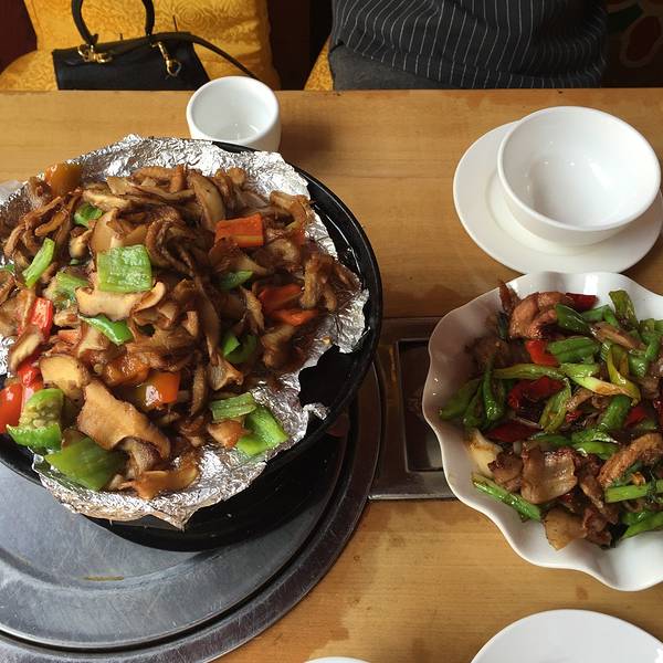 逛的差不多,在大众点评上找了家口碑比较高的小店去吃松茸。来到了松茸的故乡不吃点松茸真对不起自己的肚子。我们的午餐,很土豪的叫了一盆干锅松茸,然后再来两碗白米饭这个就是松茸,新鲜松茸的采摘季是每年的9月份左右,所以4月份想吃的新鲜的松茸是不可能的了,好吧我们吃冰鲜的总可以了吧。点了一份干锅松茸,这应该是最能展现松茸口味的烧法了吧。让松茸在铁板上煎烤,等听到滋滋的炙烤声后,你的松茸就可以品尝了,那真的是唇齿留香啊。。。。。。。。。。。。。好吧,这些我都是看舌尖上的中国学来的。不过松茸的确有其特殊的香味和口味,感觉这种菌菇有种脂香味,Co妈问我吃出了什么味道,我坦白我吃出了人民币的味道。店内环境,人气还是很旺的,店名“舌尖上的小厨师便民菜馆”