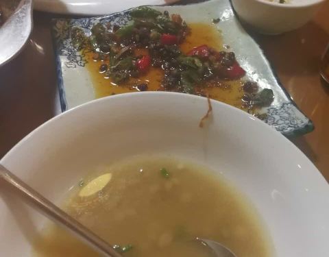 在广汉这边搜了半天,推荐的基本都是火锅或者干锅之类的,只有这家看着口味不是很重。 点了招牌的粉蒸肉,另外要了一份豌豆汤,补充一下水分。 粉蒸肉与我在其他地方吃到的都有所不同,它里面不仅有辣椒更有花椒。 豌豆汤按人收费,没想到这么大一碗,两个人也才2元,实在是太优惠了。 这家店在当地确实很火爆,我们还没吃完就开始拼桌了,可能因为个人口味的原因,所以觉得没有想象中的那么好吃。