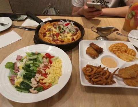 ...有优惠活动,牛排中规中矩,披萨的饼皮还是觉得有点厚,下午茶的时候人相对少一点,平时有可能要排队