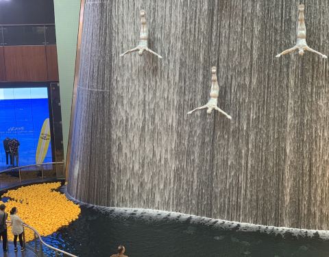 除了站在会被围的水泄不通的水池边,苹果专柜店二楼也是个绝佳的观景点。但是这些都比不上我们坐在2楼餐厅里,悠闲地享受这美妙的喷泉来得过瘾。 展开
