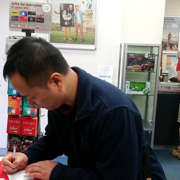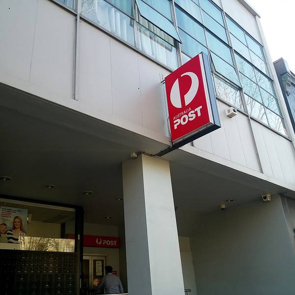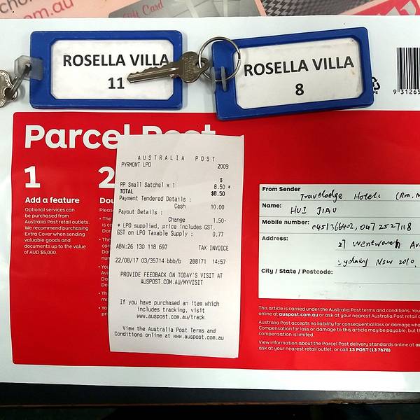 看看小伙子吃得眉毛都纵起了,难受!鱼市场用餐还是不推荐给朋友们了。离开鱼市场不远处,看见了邮局,我要在这里把忘记归还的最后一天小木屋钥匙给堪培拉的营地寄过去。这是我第一次在国外邮寄包裹,价格8.5澳元,今天在这里上图以作纪念。