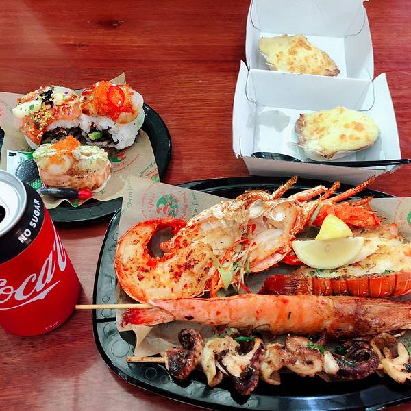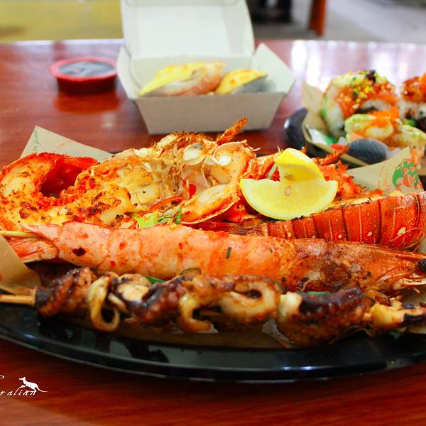 他家澳洲大龙虾的价格绝对不低,不过龙虾个头大,活力十分,是我们喜欢的,就在他家采购下单咯!海鲜市场的就餐区,就在海湾边。要小心旁边这些看似萌萌的,其实和凶的掠食者!一不小心,它们就会飞到你的桌子上,抢走你盘中的美味哦!我们抵达的时间比较早,所以这里的餐位还没有被占满。不得不承认,这里差不多都被天朝子民占领了,所以这里的服务生基本都是华裔,会说中文是必须的,然后结账可以刷银联,也可以支付宝和微信支付,非常方便。如果是时间紧张的团队客人,或者在海鲜市场安排时间紧凑的游客,建议可以直接购买已经加工好的食材,这里的日料吃起来既方便,又不会占用加工时间。XO酱鲍鱼,是他家的拿手菜。不过这个鲍鱼个头不够大,于是我们采购了市场里最大的鲍鱼,同样这样切片加工就好。对半切片的龙虾尾,看起来也很诱人吧。不过我们更喜欢采购活的来加工更好。两个人来的话,这样的拼盘也是非常不错的,生蚝,大虾,龙虾都能够品尝到了,30多澳元性价比很高呢!接下来是我们的点单到咯!首先是一打太平洋生蚝,算是当日特价,18澳元。三个大海胆,单价7.99,总共23.97澳元。澳洲大龙虾,称重2.788公斤,5斤多哦!单价169.99澳元,每公斤收取15澳元加工费,等于是184.99一公斤了。再加上龙虾尾刺身,另加15刀,每人一份芥末酱油,又是1.10元一个,然后烧龙虾加伊面底,又收了15刀……