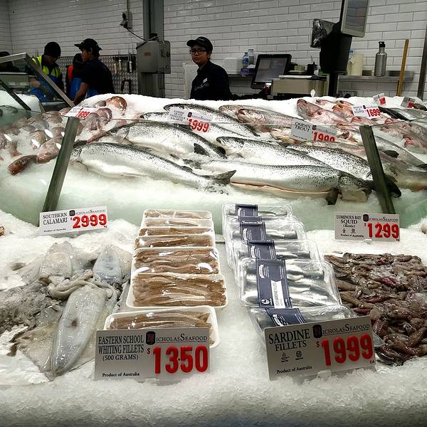Sydney Fish Market是悉尼久负盛名的海鲜市场,位于达林港西侧的Blackwater Bay海边,是在悉尼购买生猛海鲜请店家加工的场所。从CBD可以搭乘L1轻轨,或者公交501路抵达,站名就是Fish Market。从车站下车沿着这条...Sydney Fish Market是悉尼久负盛名的海鲜市场,位于达林港西侧的Blackwater Bay海边,是在悉尼购买生猛海鲜请店家加工的场所。从CBD可以搭乘L1轻轨,或者公交501路抵达,站名就是Fish Market。从车站下车沿着这条路步行过来很方便。鱼市场是一座仓储式的市场,集销售与加工于一体,深受游客,尤其是中国游客的喜爱。近年来由于中国游客的大增,这里的物价也日涨夜高,其实单纯从价格而言相对于其他餐厅并没有太大优势。但是吸引人的是它的经营业态吧,另外这里的海鲜新鲜是毋庸置疑的。海鲜市场是由一家家的店铺连缀而成,每家都竭力邀请过往的游客入内选购,生意都很兴隆的样子。从生蚝的价格来看,市场比餐厅是有一定优势的。一打18澳刀的话,每个1.5澳元;而餐厅里的生蚝价格普遍在每个4澳元左右。所以,大家可以选择最合自己眼缘,或者价格最能够符合你的预期的店家下单采购和加工。这里海鲜的品种众多,卖相都很好,明码标价也算童叟无欺。看中什么直接让服务员称重后下单加工。加工费是另外计算的。像是这里混合的海鲜,品种多,如果只有两个人来市场,可能炒一盆这样的海鲜就能够品尝到好几个品种。但是人多的话,还是建议以生猛活物为目标更好,毕竟那样更加直观,鲜活的肯定是美味的。箭鱼被这样切断出售,有点日本金枪鱼市场的味道。皇帝蟹的价格是这样的,当然,还不包括加工费等。我们选择的是这家:Nicholas Seafood Traders