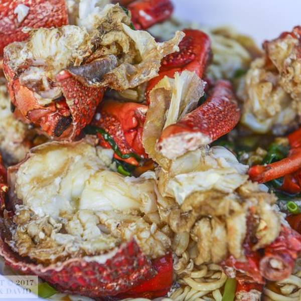 所以,整个龙虾的价格在550刀,大概2800多人民币的样子。不过,可能是生意太好了,收了每公斤15刀加工费外加15刀刺身费的龙虾尾刺身,刀工却无法恭维,大块的连刀块,和日本料理相比,真心无法登大雅之堂。购买了市场里最大的野生黑边鲍鱼,0.352公斤,同样收取了15澳元的加工费。不过,这道菜颇有水准,口味非常不错,是当天最满意的一道菜肴了。刺身外的大龙虾都炒了伊面,味道十分鲜美。总算没有愧对这只大龙虾。5斤多的龙虾,加上其他配菜,把我们四个人都吃撑了!