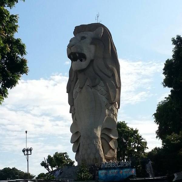 圣淘沙公园里的这座鱼尾狮像,高37米,登上塔顶可360度观赏新加坡美丽的风光,还能远眺远处的几个小岛圣淘沙公园里的这座鱼尾狮像,高37米,登上塔顶可360度观赏新加坡美丽的风光,还能远眺远处的几个小岛。