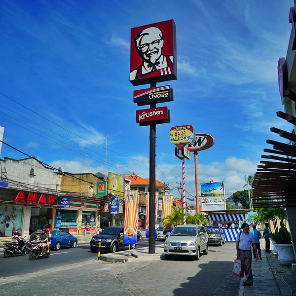 库塔是经济版的巴厘,这片喧闹的度假区,完全把它自己奉献给了娱乐和阳光。 拥挤,狭窄的小巷里,各类酒吧,廉价旅馆林立。拥挤的货摊前总是堆满了仿造的冲浪板,以及廉价的盗版DVD。