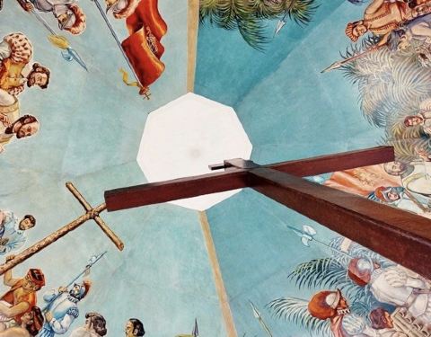 ...留下来的,一方面是为了当时祈求回程的顺利,另一方面也是传教的作用,十字架保存完好,还有一些壁画